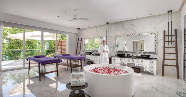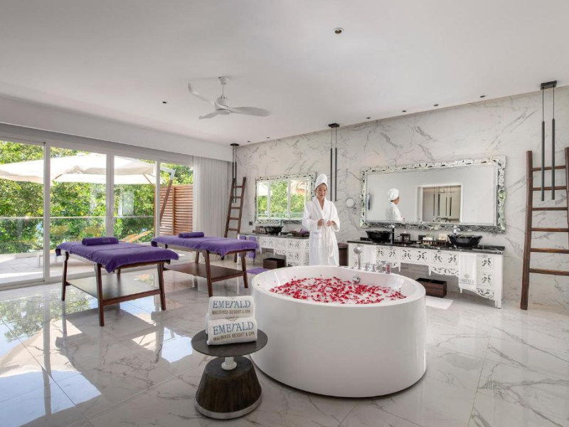 Emerald Maldives Resort & Spa - Deluxe All Inclusive este o proprietate de 5 stele situată pe insula Fasmendhoo, in partea de sud a Atolului Raa, Maldive. Insula este compusă din 20 de hectare de teren virgin si 100 de hectare de lagună albastră cristalină frumoasă.