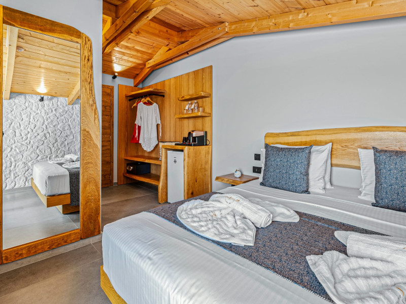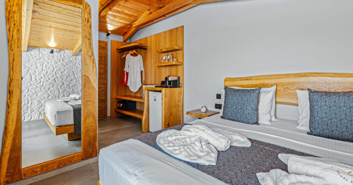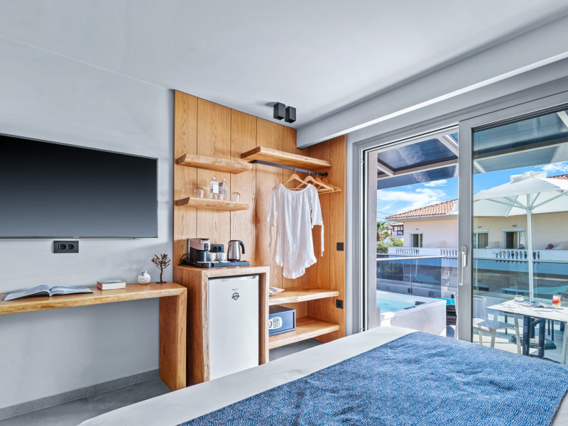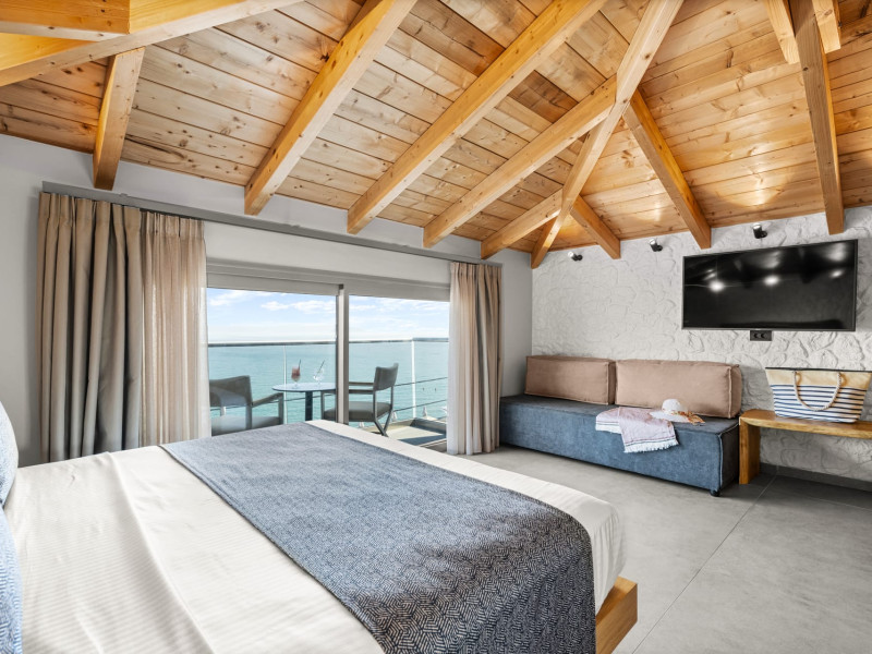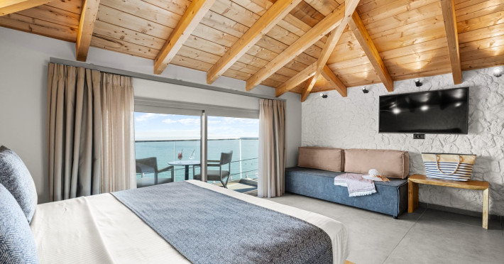 The modern and airy style of the suites and their minimalist aesthetic creates a relaxing environment for a unique stay experience. Modern design and chic furnishings come together in bright rooms with balconies or terraces that provide panoramic sea views to the Toroneos Gulf.