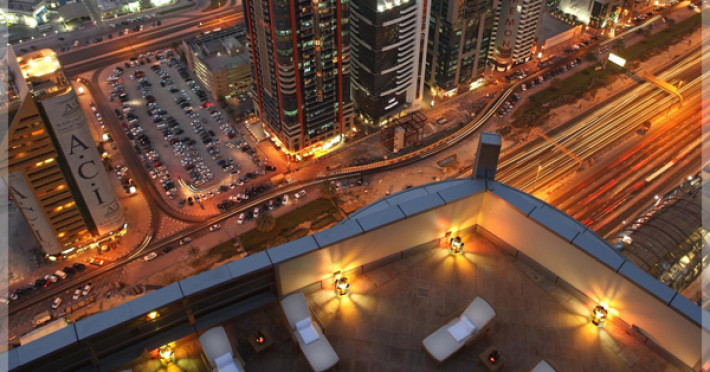 Situat in inima zonei comerciale, pe strada principala Sheikh Zayed, ofera o vedere panoramica asupra orasului si asupra Marii Arabiei.