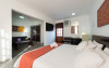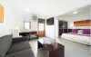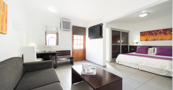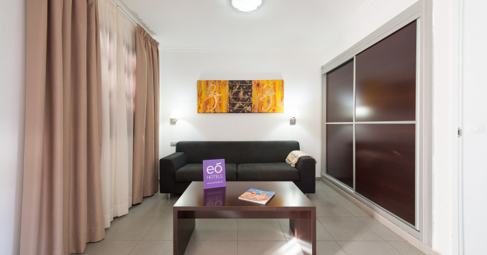 The hotel eó Suite Hotel Jardin Dorado is located approx. 2,5 km from a beach. The city centre is around 2 km away. A supermarket is just a few metres away from the hotel. In the surrounding a disco (approx. 2 km away) and a golf course offer entertainment for holidaymakers. The hotel has a 24h reception, a jacuzzi as well as a TV lounge. Outside there is a children's pool, where pool towels are available for free. Furthermore, you can relax outdoors on the sun terrace and in a garden. To clean your clothes there is a laundry service (extra fee). The rooms are cleaned. If necessary, you can contact the medical centre (for a fee). If you want to explore the holiday region, you can use the car rental service close to the hotel (extra fee). Catering Breakfast is offered from the buffet. Lunch and dinner are also served from the buffet. Your physical well-being is catered for by the pool bar. Distances