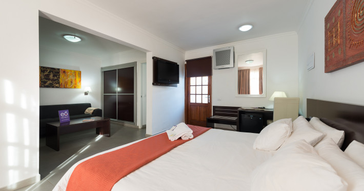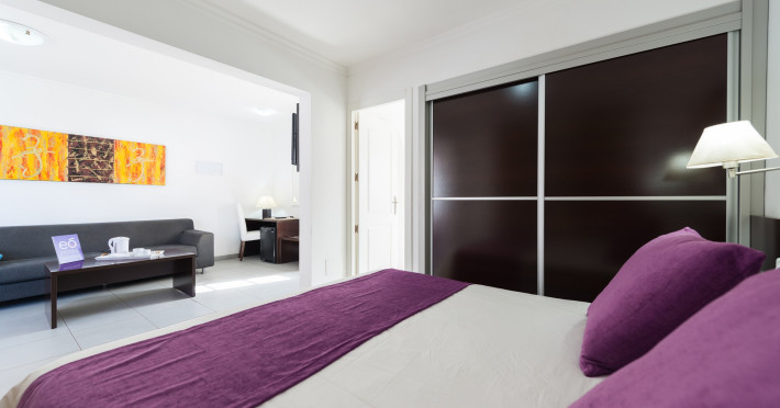 The hotel eó Suite Hotel Jardin Dorado is located approx. 2,5 km from a beach. The city centre is around 2 km away. A supermarket is just a few metres away from the hotel. In the surrounding a disco (approx. 2 km away) and a golf course offer entertainment for holidaymakers. The hotel has a 24h reception, a jacuzzi as well as a TV lounge. Outside there is a children's pool, where pool towels are available for free. Furthermore, you can relax outdoors on the sun terrace and in a garden. To clean your clothes there is a laundry service (extra fee). The rooms are cleaned. If necessary, you can contact the medical centre (for a fee). If you want to explore the holiday region, you can use the car rental service close to the hotel (extra fee). Catering Breakfast is offered from the buffet. Lunch and dinner are also served from the buffet. Your physical well-being is catered for by the pool bar. Distances