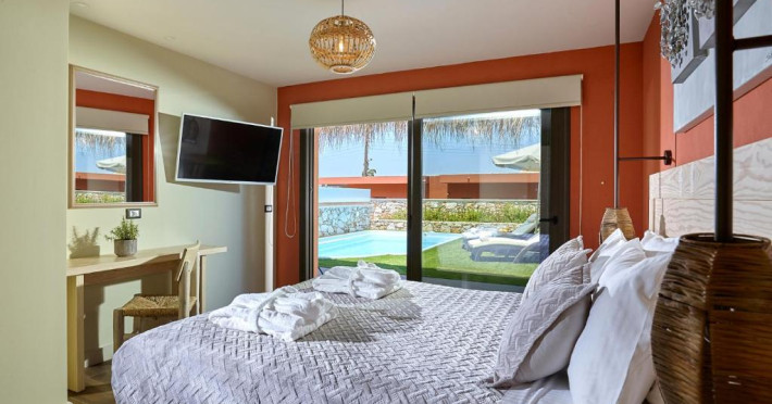 Camerele de la Esperides Resort sunt dotate cu aer condiționat, Tv cu canale prin satelit și seif. Fiecare cameră dispune de un aparat pentru preparare cafea sau ceai, cană-fierbător și minibar. Oaspeții pot solicita serviciul de room service pentru a servi masa sau diverse băuturi. Camerele au balcon cu vedere la mare sau la piscină. În camere există baie cu cadă sau duș, foehn, articole de toaletă gratuite, precum și halate de baie și papuci. Oaspeții au acces gratuit la serviciul Wi-fi în camere. Curățenia in cameră se face zilnic. Anumite camere au acces la piscină privată.