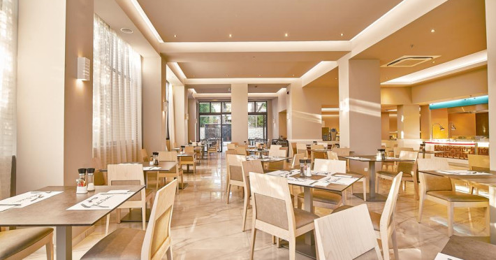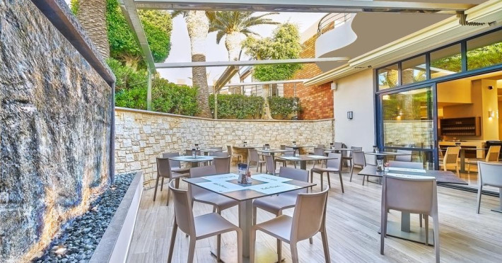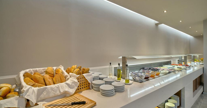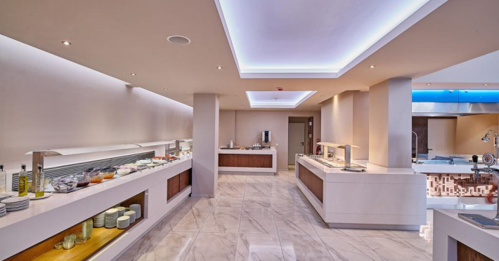 Eva Bay Hotel pune la dispoziția oaspeților un restaurant care servește mâncare în stil bufet. Preparate din bucătăria grecească și internațională așteaptă să fie degustate în fiecare zi la micul dejun, prânz și cină. Masa poate fi servită atât în interior, cît si în aer liber, pe terasă, în funcție de vreme. Sunt disponibile 2 baruri unde oaspeții pot avea diverse băuturi răcoritoare sau alcoolice.