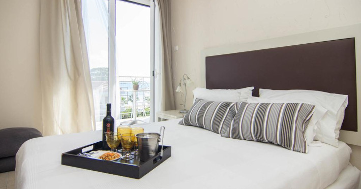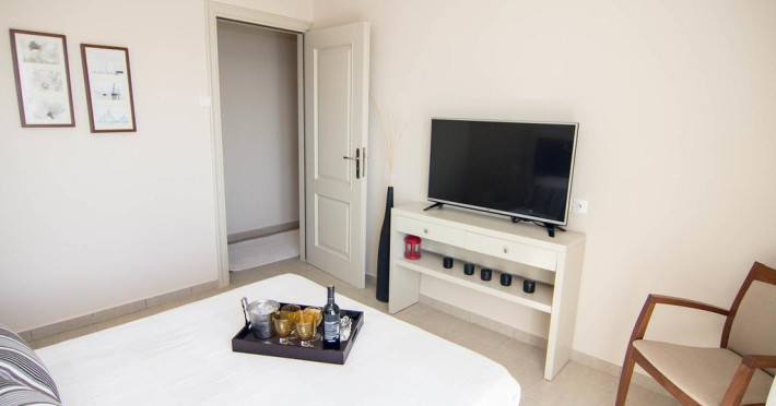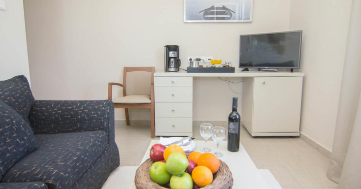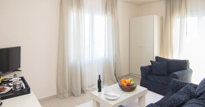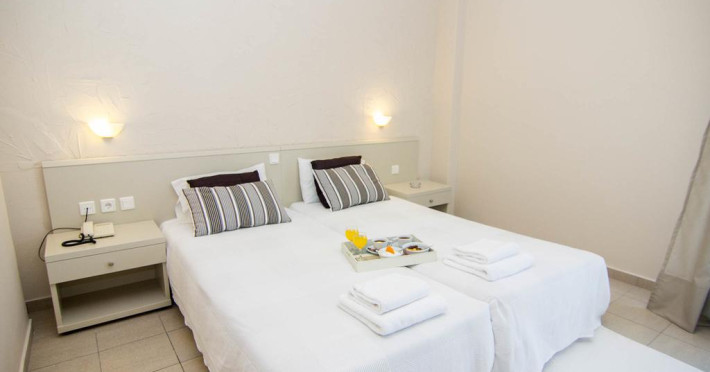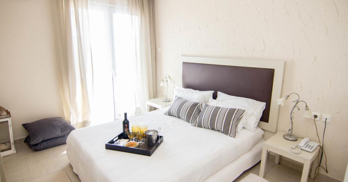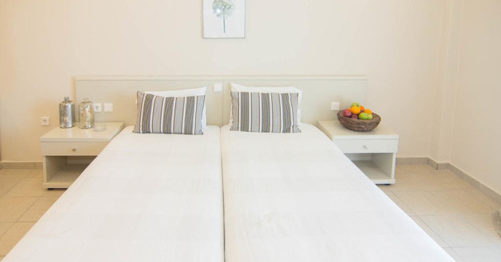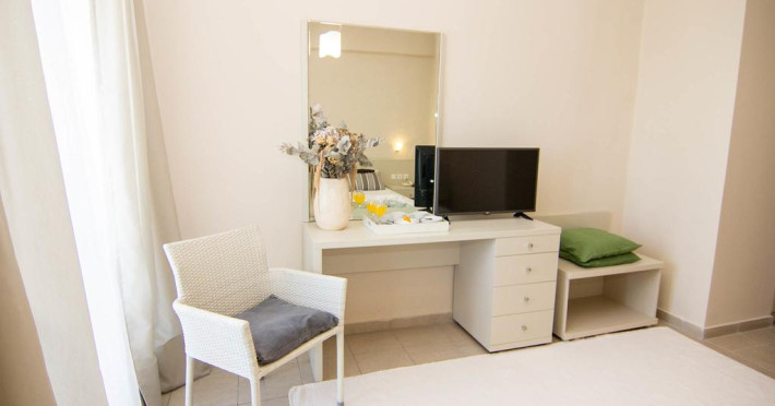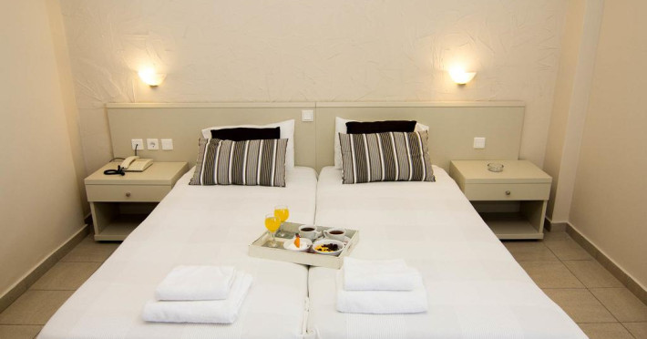 Sunt disponibile 38 camere. Fiecare cameră dispune de cană pentru prepararea apei calde. Oaspeții pot solicita serviciul de room service pentru a servi masa sau diverse băuturi. Unele camere au balcon cu vedere la mare, unde oaspeții pot admira apusul sau răsăritul soarelui. În camere există baie cu cadă sau duș ce are în dotare foehn și articole de toaletă gratuite. Camerele luminoase de la Eviana Beach sunt dotate cu aer condiționat, Tv și seif. Curățenia in cameră se face zilnic. Fiecare unitate de cazare are frigider. Proprietatea oferă camere pentru familie cu o suprafață mai mare și un număr mai mare de paturi față de cele standard. Se pot rezerva de asemenea camere pentru nefumători.