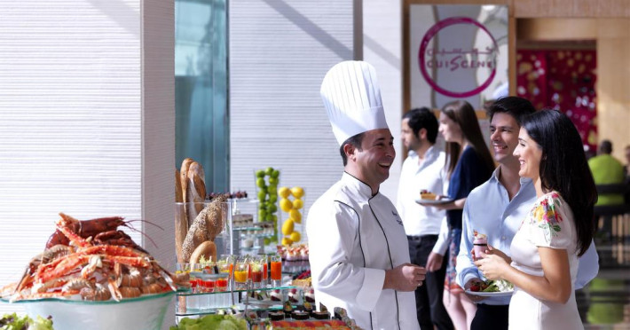 La Fairmont Bab Al Bahr oaspeții au la dispoziție 5 restaurante unde pot savura mâncăruri delicioase, în stil bufet sau à la carte. Preparate din bucătăria internațională și orientală așteaptă să fie degustate în fiecare zi. Masa poate fi servită atât în interior, cît si în aer liber, pe terasă, în funcție de vreme. Oaspeţii pot avea diverse băuturi răcoritoare sau alcoolice la bar. În cadrul proprietății există și o patiserie care servește diverse delicatese.
