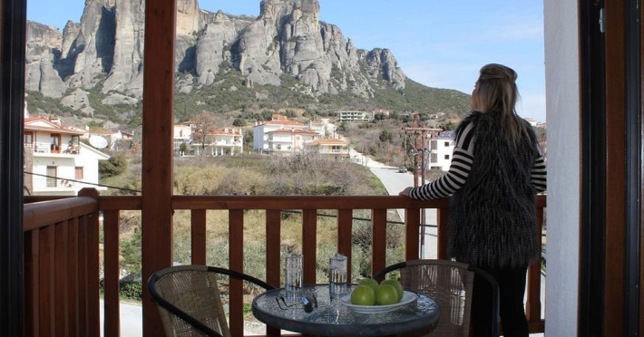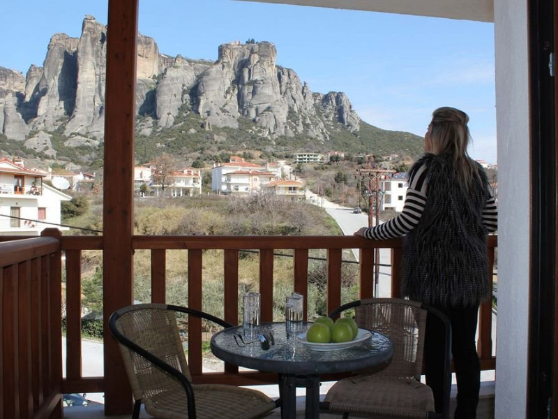 Aer conditionat, incalzire, TV prin satelit, telefon, cada/dus, uscator de par, radio, acces gratuit la internet Wi-Fi, balcon, vedere la Meteora.