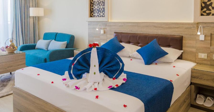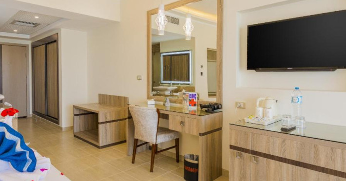 Camerele confortabile de la Fantazia Hotel au pardoseală de gresie/ marmură, aer condiționat, Tv cu canale prin satelit și seif. Fiecare cameră dispune de minibar. Oaspeții pot solicita serviciul de room service pentru a servi masa sau diverse băuturi. În camere există baie cu cadă sau duș, foehn, articole de toaletă gratuite, precum și halate de baie și papuci. Oaspeții au acces gratuit la serviciul Wi-fi în camere. Camerele au balcon cu vedere la mare sau la piscină. Curățenia in cameră se face zilnic. Proprietatea oferă camere pentru familie cu o suprafață mai mare și un număr mai mare de paturi față de cele standard.