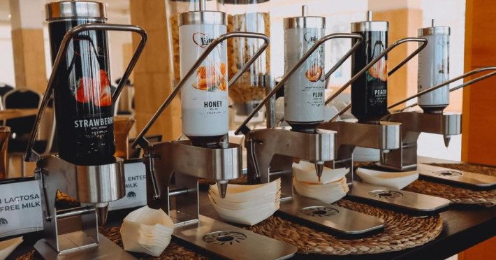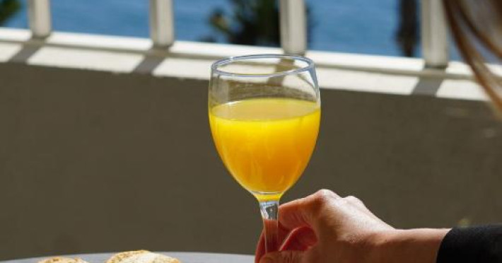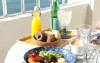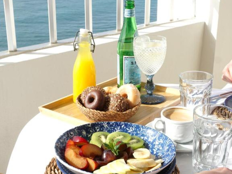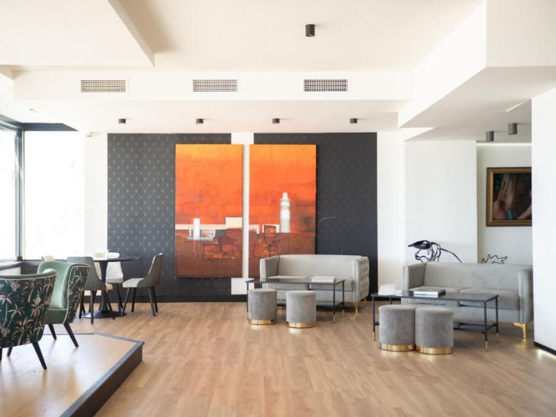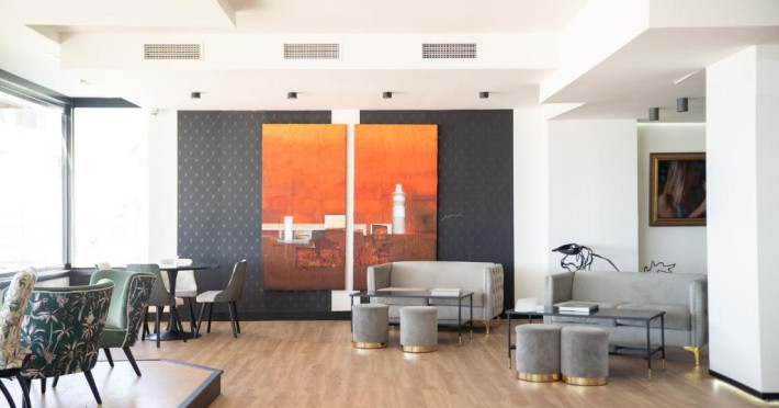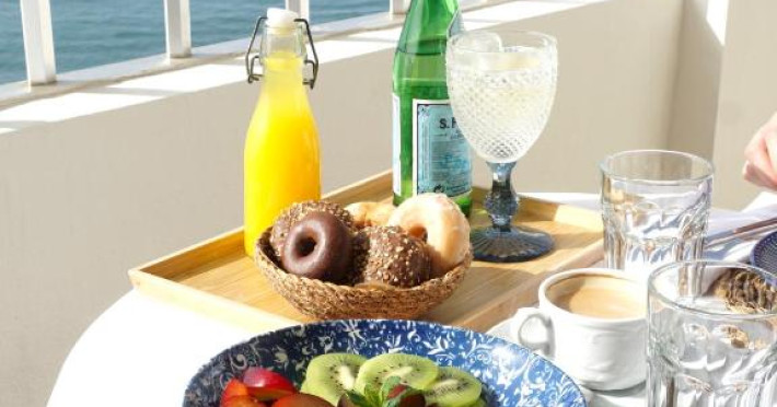 Cafeneaua cu terasă a Hotelului Fay Victoria Beach este situată chiar pe promenada de pe malul mării.