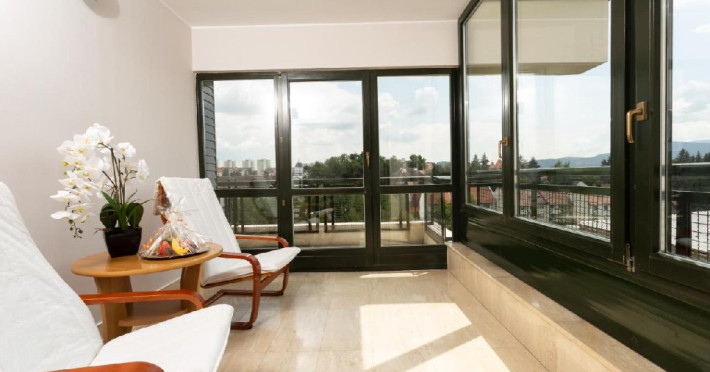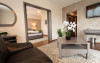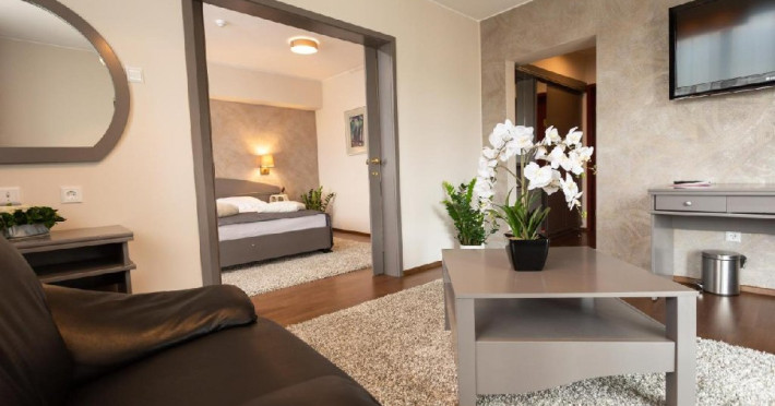 Suita de lux (68 mp) ofera recreatie exclusiva pentru oaspetii care doresc sa se bucure de o experienta personalizata. Situata la ultimul etaj, suita ofera peisaje pitoresti ale muntilor. Suita are terase deschise si de tip mediteranean. Relaxarea va deveni si mai placuta datorita jacuzziul din mozaic.