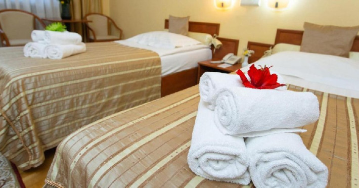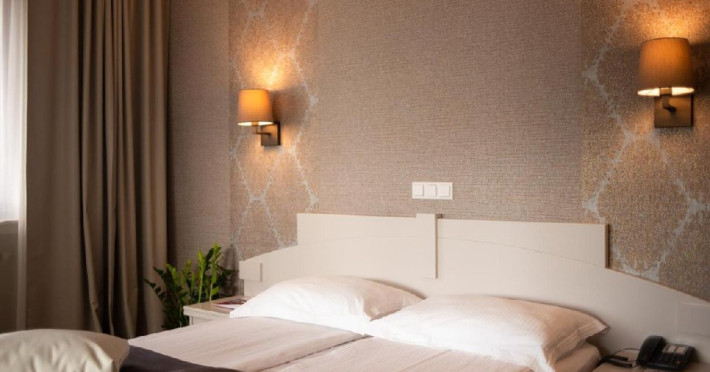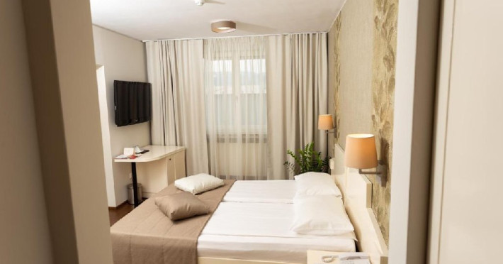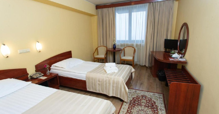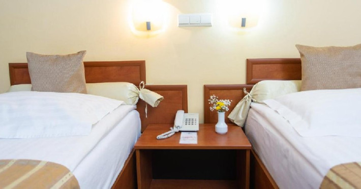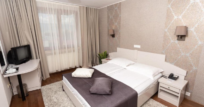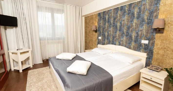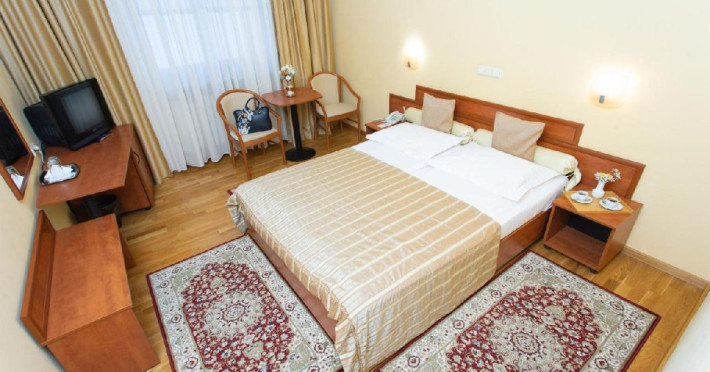 Camera single: suprafata de 20.66 mp, pat dublu, baie cu cada, uscator de par si alte articole de toaleta, minibar, televizune cu program de grila analogica si digitala, telefon cu fir si internet wireless (WIFI). Camerele au vedere la frunzisul verde al parcului central si al orasului.Camera dubla standard: suprafata de 20 mp, pat dublu, baie cu cada, uscator de par si alte articole de toaleta, minibar, televizune cu program de grila analogica si digitala, telefon cu fir si internet wireless (WIFI). Camerele au vedere la frunzisul verde al parcului central si al orasului. Camerele standard pot fi echipate cu paturi suplimentare pentru un adult sau un copil.