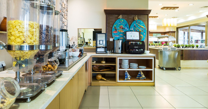 Locurile unde se poate lua masa cuprind o sală de mese, o sală pentru micul dejun, o cafenea și un bar. Clienților le stă la dispoziție un restaurant pentru nefumători cu aer condiționat, cu scaune înalte pentru copii și o zonă separată pentru nefumători. Satul de vacanță oferă pentru masă pachete de servicii cu mic dejun inclus, demipensiune și pensiune completă. La mic dejun și o cină se organizează un bufet divers. Sunt disponibile și mâncăruri speciale, printre care feluri de mâncare vegetariene. De asemenea, complexul pune la dispoziție oferte speciale de masă. Stau la dispoziție băuturi alcoolice.