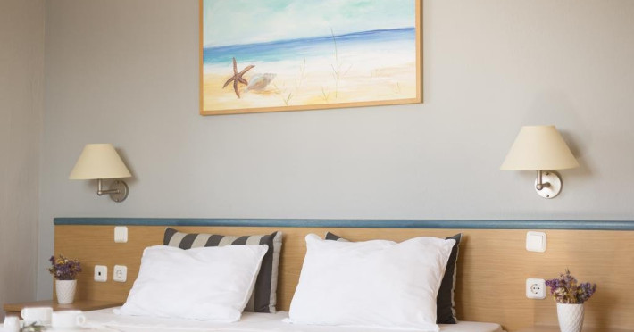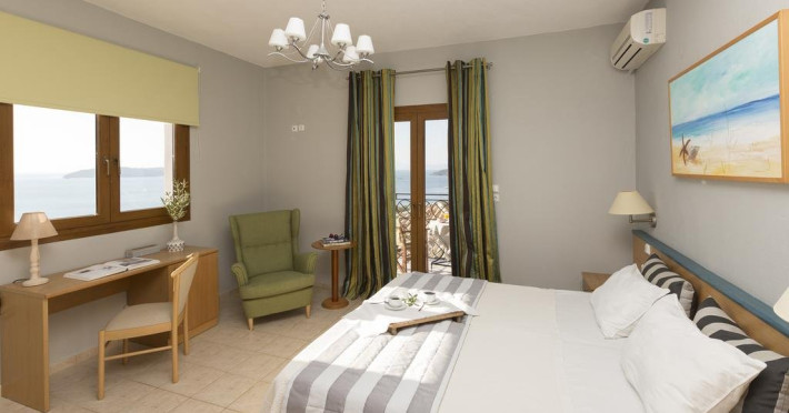 Facilitati camera: 17 camere frumos decorate si primitoare, impartite in camere standard ( 22 mp, vedere partial la mare), camera superioare ( 25 mp, vedere la mare) si maisonette ( camera pe 2 etaje, 1 canapea la parter si un pat dublu la etaj, vedere la mare).