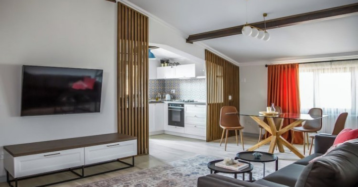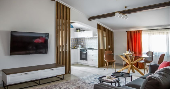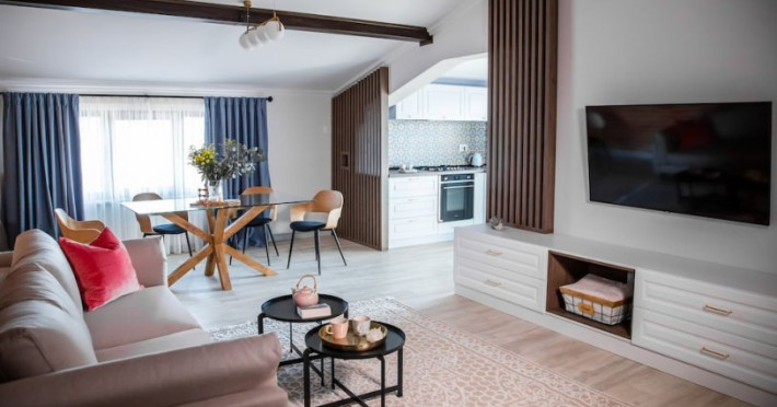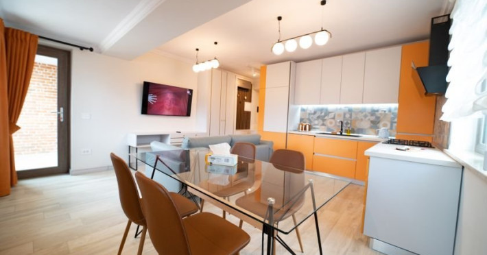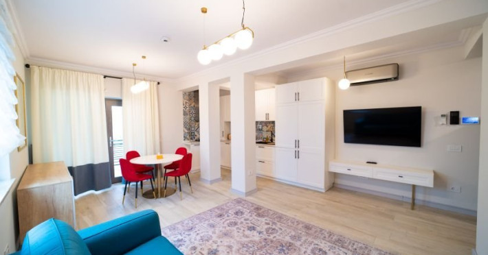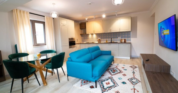 FIRST APARTMENTS Focsani, un proiect exclusivist , inovator,cladirea finalizata in anul 2023,asezata pe 2 etaje , cuprinde 8 apartamente de lux cu 2 si 3 camere, mobilate si utilate pana in cele mai mici detalii. Situat in centrul orasului Focsani, strada Timis nr. 5, intr-o zona exceptionala in apropiere de centrul orasului, Piata Unirii,parcul Nicolae Balcescu, magazine, farmacii, scoli, gradinite, la 2 pasi de cele mai renumite restaurante si locuri de petrecut timpul liber, pe o strada linistita, ultracentrala, dar feritra de zgomotul si traficul orasului. Apartamentele proprietatii sunt dotate cu centrala termica si incalzire prin pardoseala, Aer Conditionat ( o unitate in apartament cu 2 camere si 2 unitati in apartemente cu 3 camere), masina de spalat rufe cu uscator, masina de spalt vase, internet wi-fi,smart TV, sunt doar cateva elemente ce ofera un plus de confort.Fiecare apartament dispune de cate o terasa generoasa. Pentru un plus de siguranta si confort ,locatia ofera parcare in limita locurilor disponibilie, supravegheata video non-stop si statie de incarcare a masinilor electrice. Fumatul nu este permis. Animalele de companie nu sunt acceptate. Petrecerile/evenimentele nu sunt permise.Datorita dinamicitatii domeniului disponibilitatea ofertelor se modifica de la un moment la altul. De aceea ofertele sunt valabile in limita locurilor disponibile. Agentia nu este responsabila pentru eventualele neconcordante care pot aparea intre informatiile privind tarifele si alte detalii din site si informatiile primite in agentie. In aceste cazuri vor avea prioritate, intotdeauna, informatiile primite in agentie.