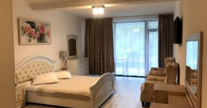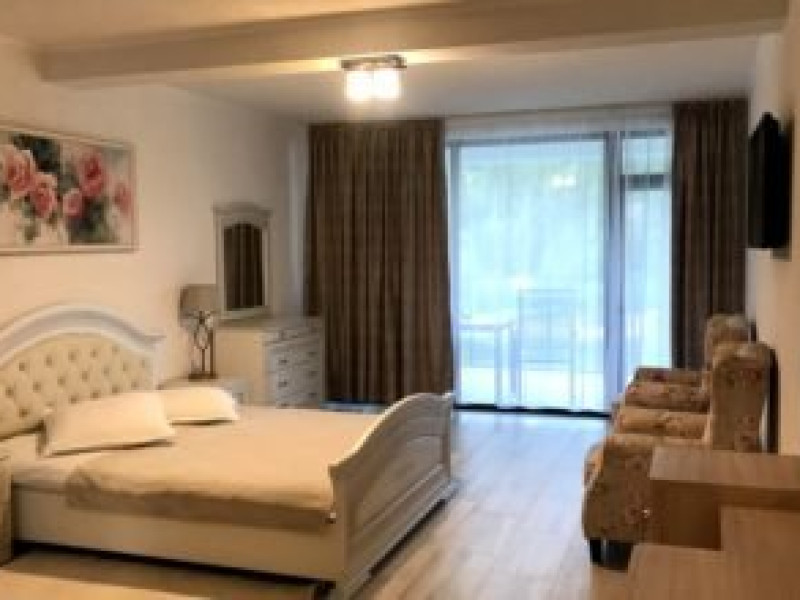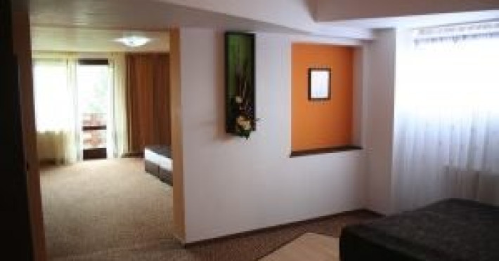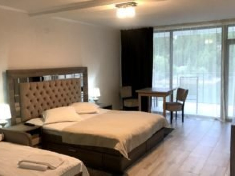 Apartamentele ofera un dormitor si o sufragerie. Dormitorul este dotat cu pat matrimonial, noptiere, masa de scris, comoda cu miniseif, diverse spatii de depozitare, televizor LCD cu cablu TV, terasa cu vedere la lac si muntii din jur.