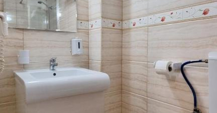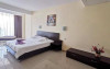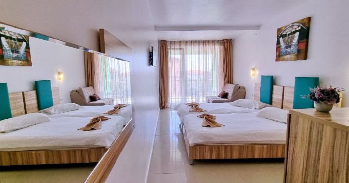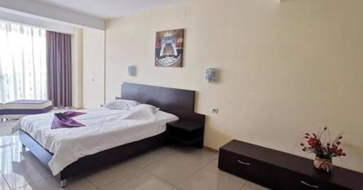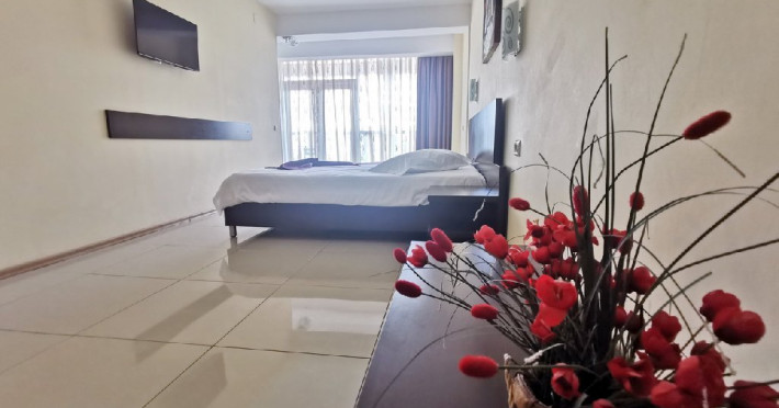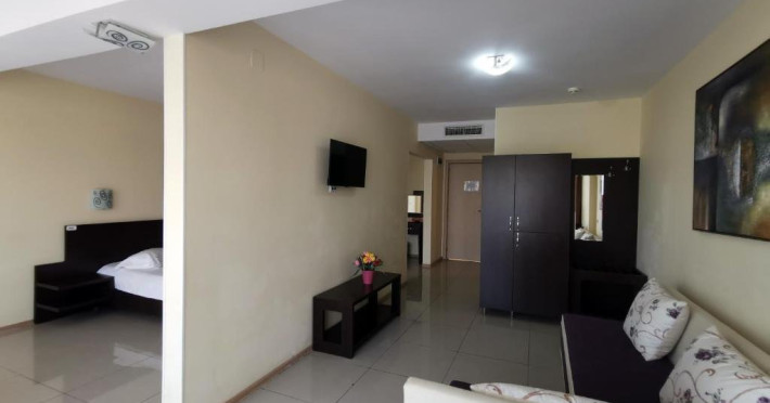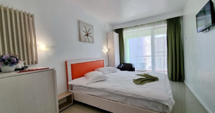 Facilitati apartament: living ce are in dotare o canapea modulara (spatioasa pentru odihna a doua persoane) si mobilier nou (sifonier, doua fotolii cu masuta, televizor cu plasma, birou, comoda); dormitor compus dintr-un pat matrimonial si mobilier nou (noptiera cu oglinda, sifonier); sistem de climatizare; telefon; televiziune prin cablu; minibar; pardoseala din gresie; baie proprie (mobilier, cabina de dus, uscator de par); balcon cu mobilier de balcon (masuta si scaune) si suport rufe; plasa de insecte; conexiune internet wireless.