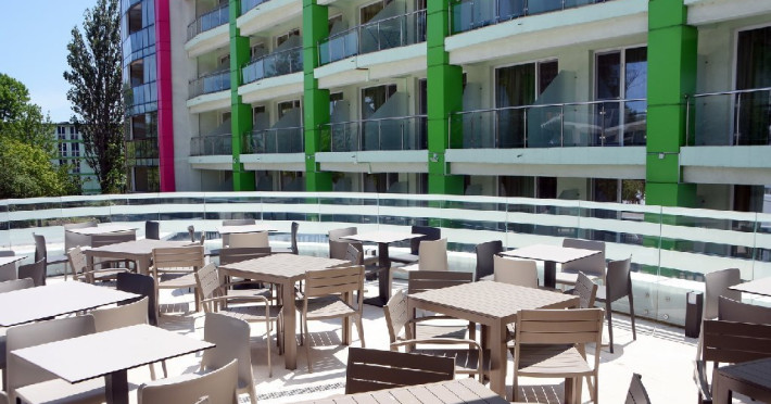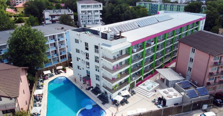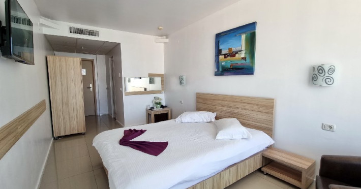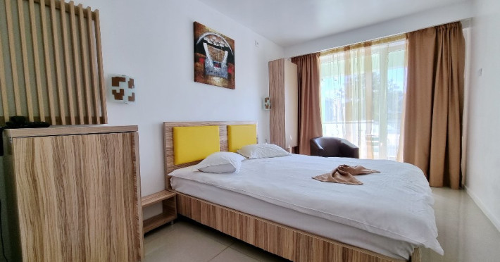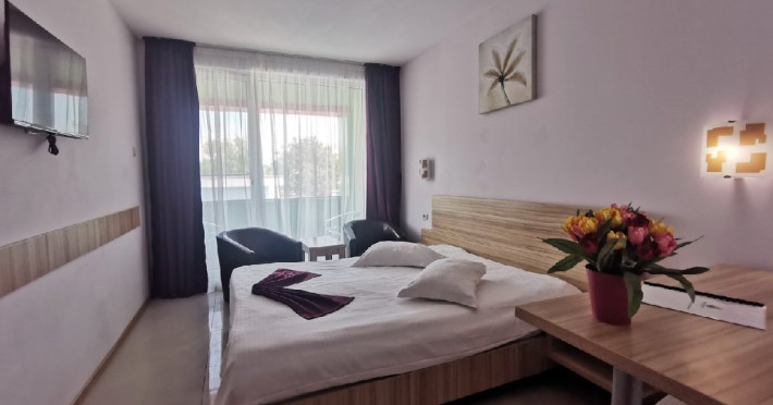 Camere: Hotelul are 49 camere twin, 100 de camere cu pat matrimonial si 8 apartamente, dispuse pe patru nivele si parter, dotate cu mobilier nou, televiziune prin cablu, minibar, baie cu dus, balcon, mobilier de balcon (sezlonguri si masuta), sistem de climatizare, telefon, internet wireless, pardoseala din gresie si card electromagnetic, pentru accesul in camera.