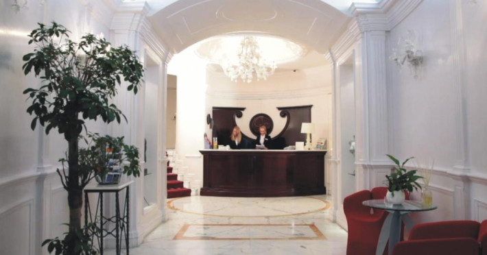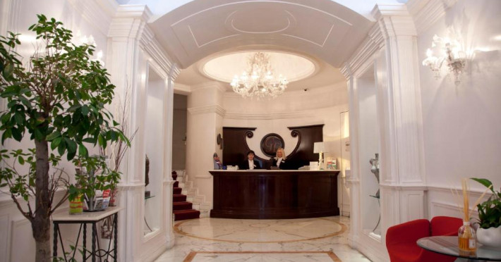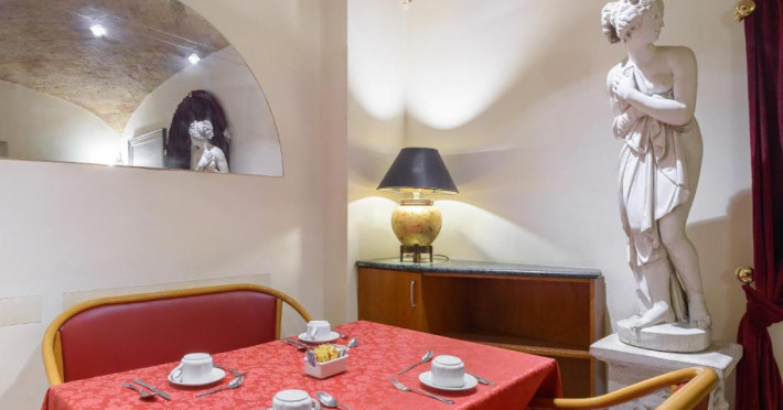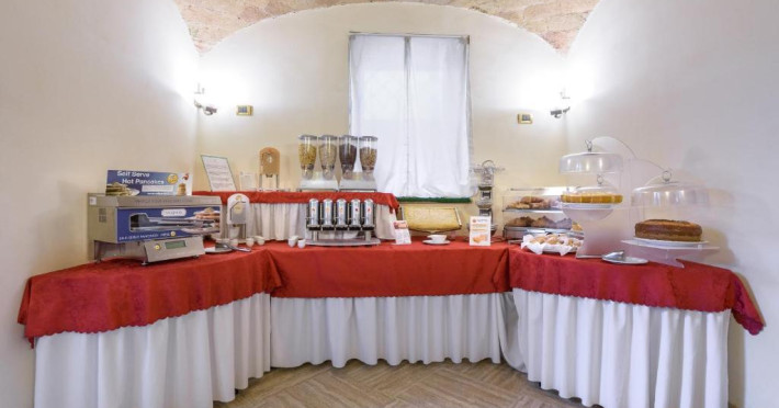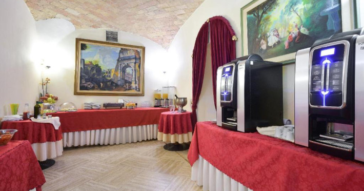 Sala de mic dejun este frumoasă și oferă tavan boltit ornat cu lucrări din piatră originală din secolul al XIX-lea și pardoseală din travertin roman. In fiecare zi este servit un bufet generos, care include cereale, paine, produse de patiserie, fructe proaspete, ouă, branzeturi și mezeluri.