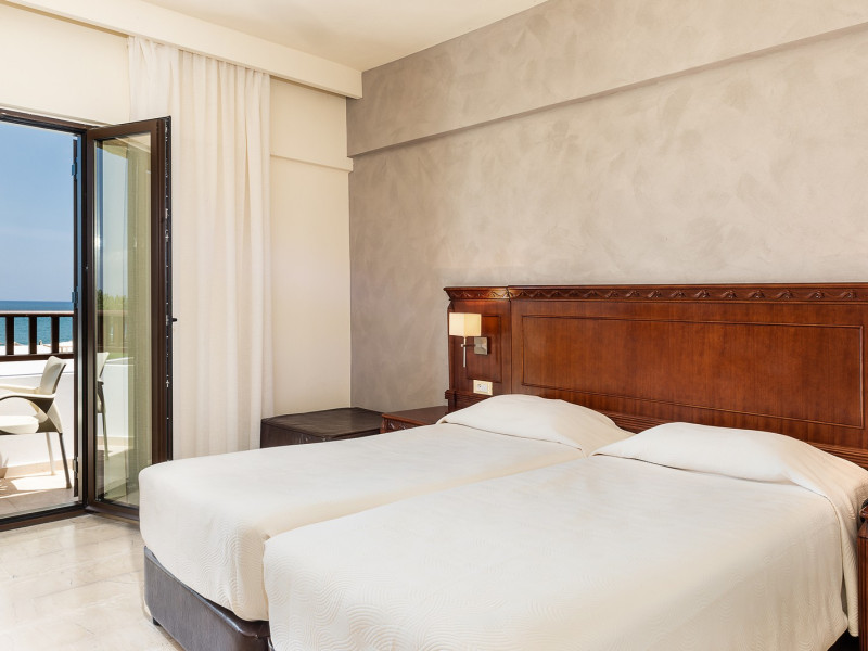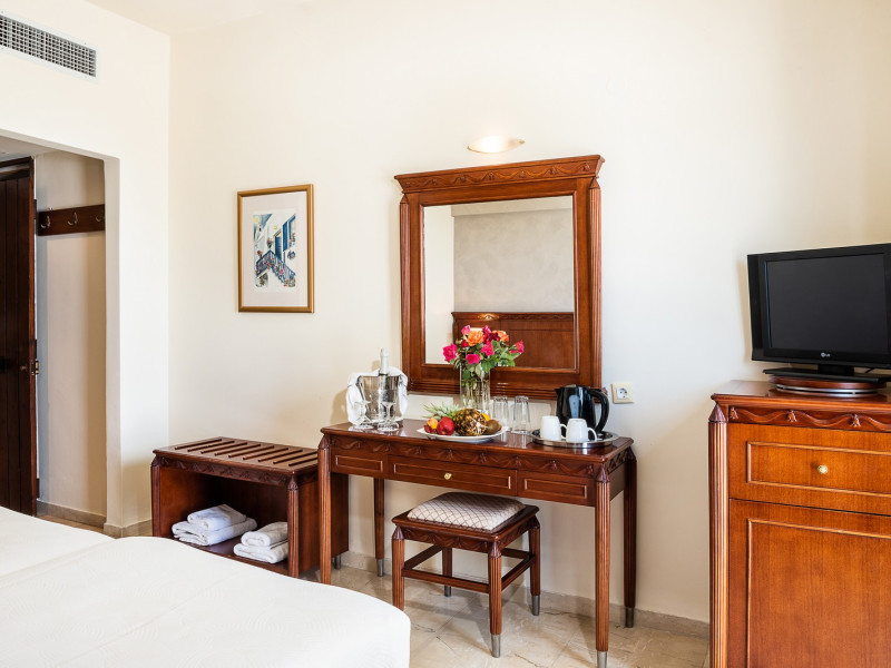The hotel consists of 81 rooms ( all the rooms are renovated –last renovation in 2015-2017) and 56 apartments fully equipped With bathroom with shower or bath, air conditioning, hair dryer, telephone ,Television, fridge, water kettle , music. balcony or terrace with direct or site sea view, Safe deposit box in the room or reception area.The hotel is famous for its flourishing gardens and includes a children's playground,Fitness center, Restaurant, cafe-bar, Pool bar 2 large pools for adults and 2 separate children pools. The sun loungers and umbrellas around the pool are free of charge, the sun loungers and umbrellas at the beach are with extra charge.