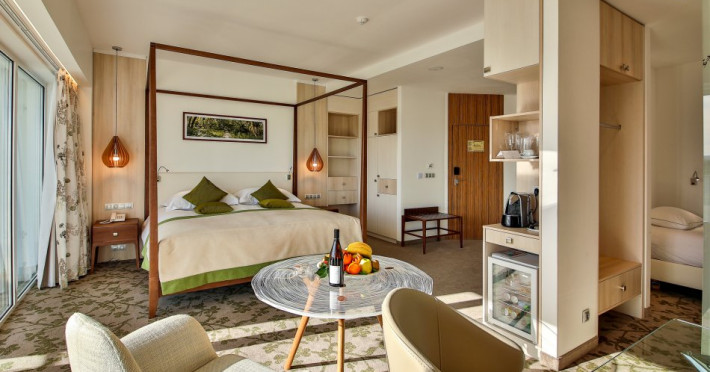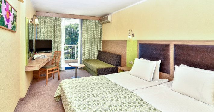 Camerele și apartamentele sunt amenajate modern și dispun de aer condiționat, baie cu dus, telefon, TV și televiziune prin cablu, internet wireless, balcon cu vedere spre mare sau spre parc.
