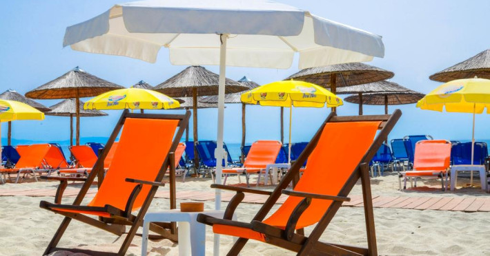 Giannoulis dispune de plajă privată. Pe plajă există șezlonguri și umbrele de plajă.