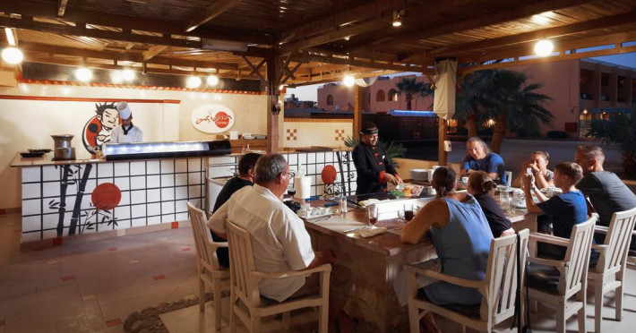La Giftun Azur oaspeții au la dispoziție 7 restaurante unde pot savura mâncăruri delicioase, în stil bufet sau à la carte. Preparate din bucătăria locală, internațională, italiană, precum și preparate pescărești așteaptă să fie degustate în fiecare zi. Masa poate fi servită atât în interior, cît si în aer liber, pe terasă, în funcție de vreme. 7 baruri, dintre care unul la piscină, sunt disponibile cu o ofertă variată de băuturi răcoritoare și alcoolice. În cadrul proprietății există și un snack bar care servește băuturi și gustări.