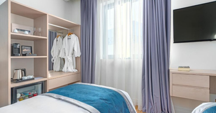 Camerele sunt decorate in nuante de ocru si au mobilier din lemn de culoare deschisă. Acestea sunt confortabile si dotate cu aer conditionat si TV prin satelit. Zilnic este servit un mic dejun tip bufet. Hotelul pune la dispozitie un restaurant si un bar. Se oferă room service disponibil de la ora 07:00 pană la miezul noptii.