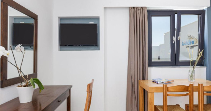 Camerele luminoase de la Golden Bay Hotel & Bungalows sunt dotate cu aer condiționat, Tv și seif. Fiecare cameră oferă cană-fierbător și mașină pentru prepare cafea sau ceai. Oaspeții pot solicita serviciul de room service pentru a servi masa sau diverse băuturi. Camerele au balcon cu vedere la mare sau la piscină. În camere există baie cu cadă sau duș prevăzută cu foehn. Oaspeții au acces gratuit la serviciul Wi-fi în camere. Curățenia in cameră se face zilnic. Există unități de cazare care au chicinetă utilată cu frigider și ustensile de bucătărie. Proprietatea oferă camere pentru familie cu o suprafață mai mare și un număr mai mare de paturi față de cele standard.