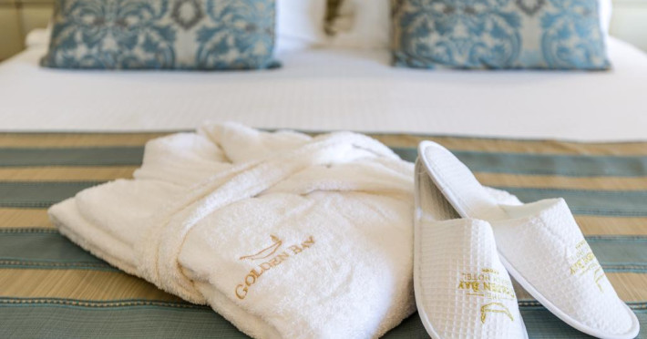 Din facilitățile oferite de proprietate nu lipsește centrul de wellnes și spa, unde oaspeții pot încerca diferite tratamente de înfrumusețare sau se pot relaxa la masaj sau la saună. Golden Bay are în dotare cadă cu hidromasaj. Pentru cei interesați proprietatea oferă manichiură & pedichiură, coafor, tratamente faciale pentru toate tipurile de ten și tratamente corporale. În cadrul proprietatății există piscină interioară pentru lunile mai reci sau pentru zile toride, precum și piscină exterioară cu tobogan cu apă, pentru cei dornici de distracție. Piscina exterioară este prevăzută cu șezlonguri confortabile, prosoape și umbrele de soare, precum și cu un bar unde oaspeții pot degusta băuturi alcoolice sau răcoritoare.