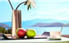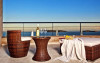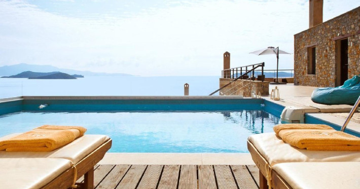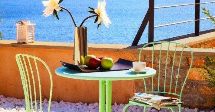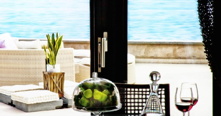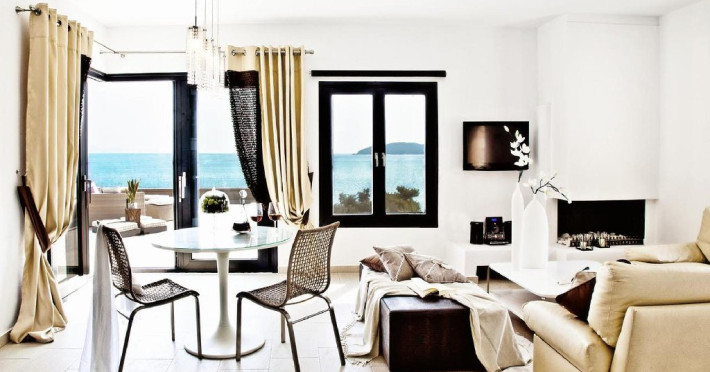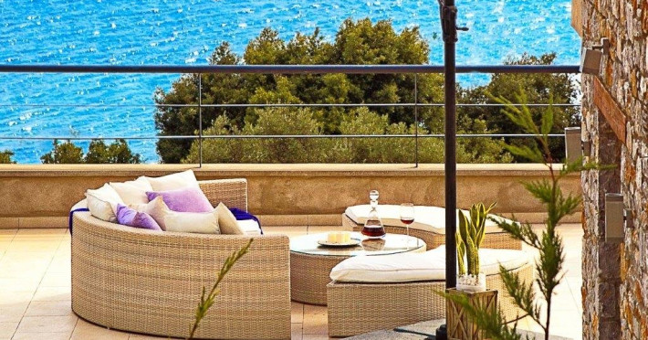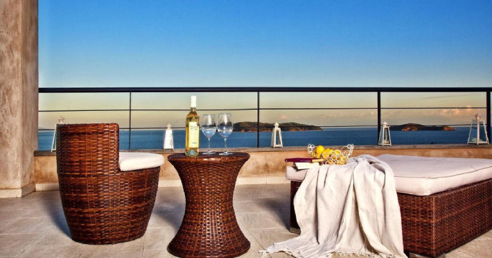 Din camera de zi va puteti bucura de o priveliste spectaculoasa catre mare si piscina privata a vilei. Fiecare apartament dispune si de o terasa mare (70 mp). Camera de zi are sistem de aer conditionat, un TV cu plasma de 33 de inch, CD, DVD, Mp3 player.