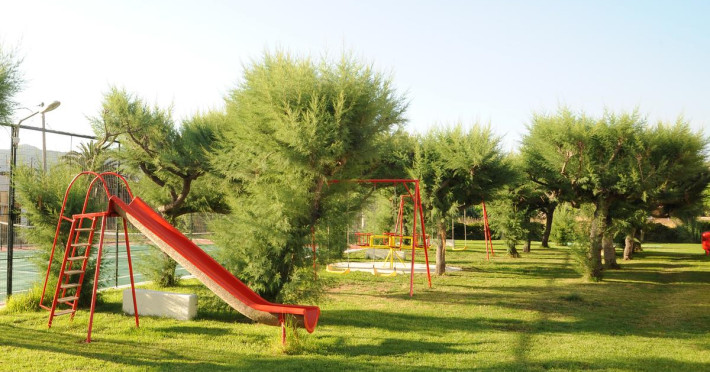 Loc de joacă, tenis și terenuri mici de baschet, bar de la piscină pentru o băutură răcoritoare sau o gustare sub palmieri.