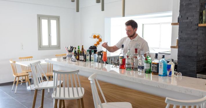 La Goulielmos oaspeții au la dispoziție un restaurant care servește mâncare à la carte. Preparate din bucătăria grecească așteaptă să fie degustate în fiecare zi. Masa poate fi servită atât în interior, cît si în aer liber, pe terasă, în funcție de vreme. Oaspeţii pot avea diverse băuturi răcoritoare sau alcoolice la bar. Pentru cei cu anumite nevoi de nutriție, Goulielmos oferă meniuri pentru diete speciale.