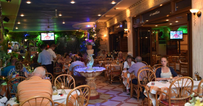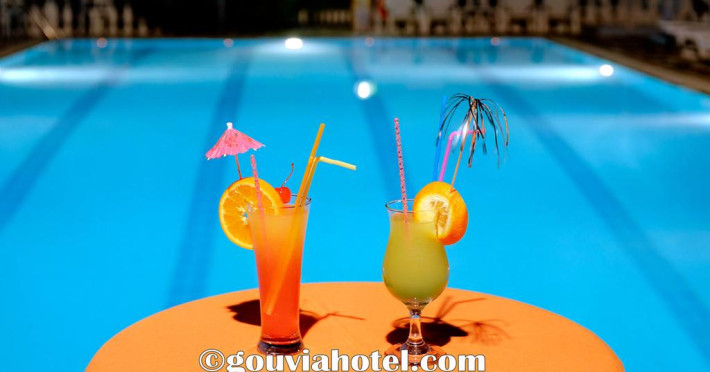 La Gouvia oaspeții au la dispoziție 2 restaurante unde pot savura mâncăruri delicioase, în stil bufet sau à la carte. Preparate din bucătăria locală și internațională așteaptă să fie degustate în fiecare zi la micul dejun, prânz și cină. Masa poate fi servită atât în interior, cît si în aer liber, pe terasă, în funcție de vreme. Oaspeţii pot avea diverse băuturi răcoritoare sau alcoolice la bar. În cadrul proprietății există și un snack bar care servește băuturi și gustări.