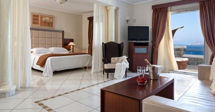 Suitele Honeymoon (35 m2) dispun de o zona de relaxare separata, o baie cu jacuzzi, balcon spatios cu o canapea si vedere asupra marii Egee.