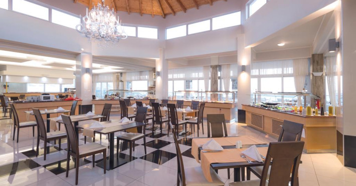 La Grand Blue Beach oaspeții au la dispoziție 3 restaurante unde pot savura mâncăruri delicioase, în stil bufet sau à la carte. Preparate din bucătăria grecească și internațională așteaptă să fie degustate în fiecare zi la micul dejun, prânz și cină. Masa poate fi servită atât în interior, cît si în aer liber, pe terasă, în funcție de vreme. 3 baruri sunt disponibile cu o ofertă variată de băuturi răcoritoare și alcoolice.