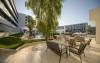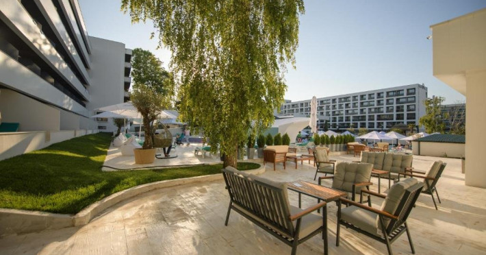 Terasa spatioasa a apartamentului este dotata cu masuta, 2 scaune si 2 sezlonguri. De aici, exista acces direct(iesire) la terasa exterioara si zona de piscine.