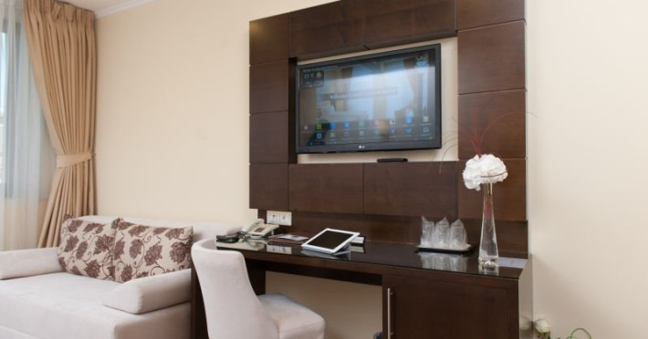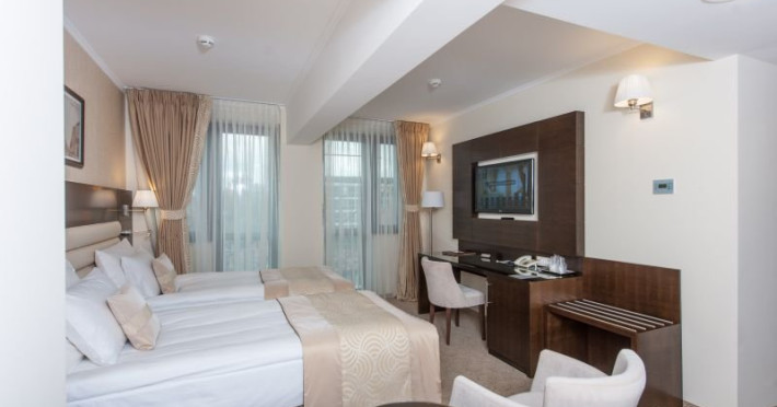 Hotelul dispune de 109 camere, totalizand 188 locuri de cazare dispuse astfel: 38 de camere cu un pat sau paturi matrimoniale, 71 de camere cu 2 paturi si 4 apartamente.Fiecare spatiu de cazare este echipat cu baie si toaleta, minibar, telefon, televizor color si cablu.