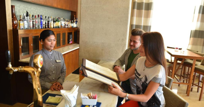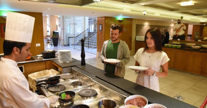 Restaurantul Aziab cu vedere frumoasă la Marea Roșie servește specialități regionale și internaționale in aer liber. Cocktail-uri, vinuri și gustări ușoare sunt disponibile la barul Sunset.