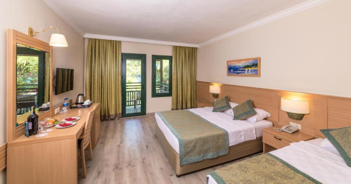Camerele din cladirea principala,(cele mai multe cu vedere la mare),au paturi twin şi unele dintre ele au pat dublu,baie (cu cada), WC, seif, balcon, incalzire centrala si sistem de racire, telefon direct, TV satelit mini-bar (gol), covoare.(Max ocupare 3 persoane.) Camerele pentru Familii, (unele cu vedere la mare, iar unele cu vederela padure),au living cu o canapea si un dormitor.Facilitatile sunt aceleasi ca si camerele din cladirea principala. (Min. ocupare 4, max ocupare 6 persoane.) Camerele gen Bungalow au cate un pat dublu si unul single ,podea din marmura, balcon, terasa, iar cele mai multe dintre camere au vedere la mare. Restul facilitatilor sunt aceleasi cu cele din camerele din clădirea principala.(Max. ocupare 4 persoane.)