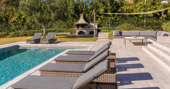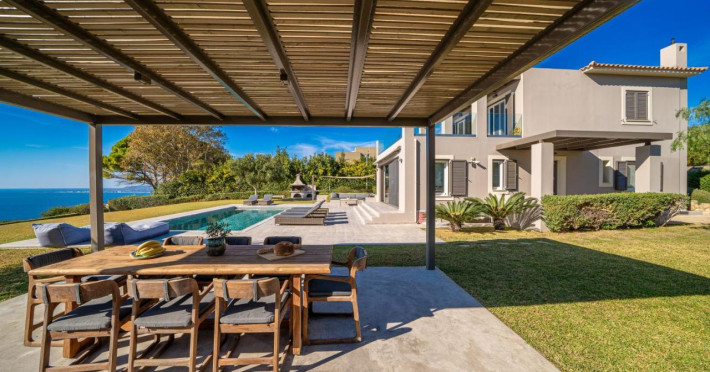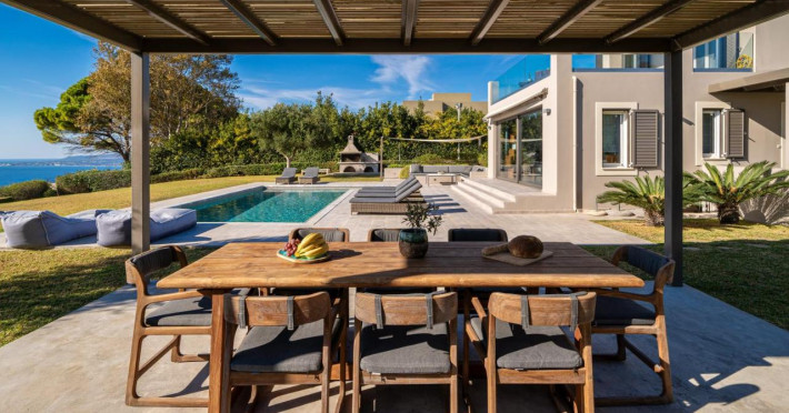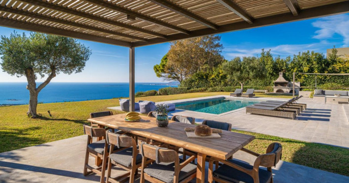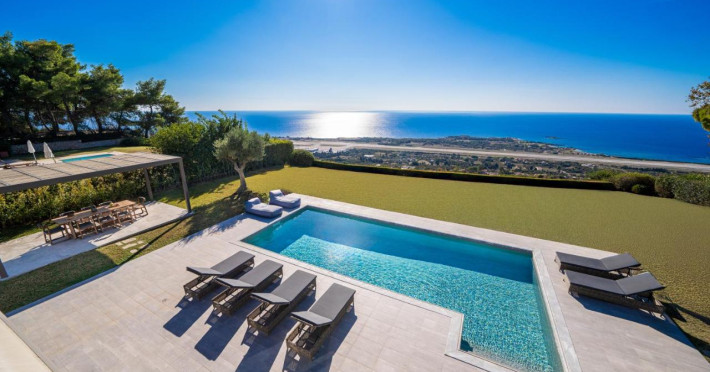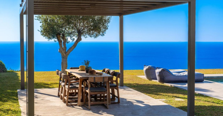 Set in its own large ½ acre plot, Grande Azzurro is modern & minimalistic in design and can be honestly described as having the most breathtaking panoramic views of pretty much anywhere on the island and from every single aspect of the property. The extensive private grounds are fully landscaped and beautifully manicured all around, with the feature lawn area housing the patios, pool area, Al Fresco dining pergola, large external kitchen/BBQ area & an amazing more casual seating area: simply perfect for those mid-morning coffees and early evening cocktails alike. From every single area of the garden, the clear Blue Azure of the Ionian Sea is sure to dazzle and hypnotize in equal measures, as you sit or lie and just immerse yourself in these mesmerizing views.