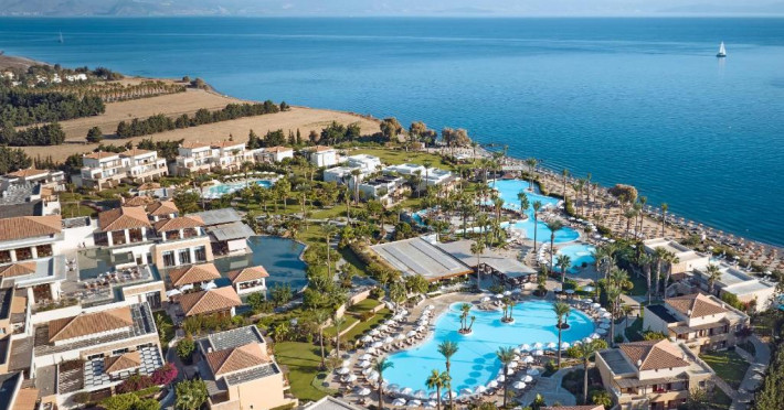 Oaspeții se pot bucura de plaja privată cu nisip și pietriș din fața hotelului, dotată cu șezlonguri și umbrele. Complexul dispune de 4 restaurante cu specific grecesc și internațional, centru spa cu tratamente de relaxare, precum și multiple facilități pentru sport și agrement.
