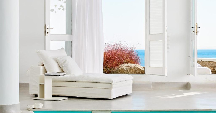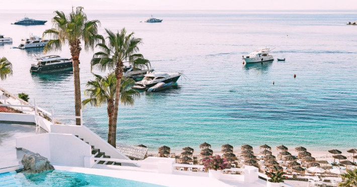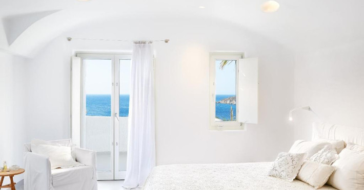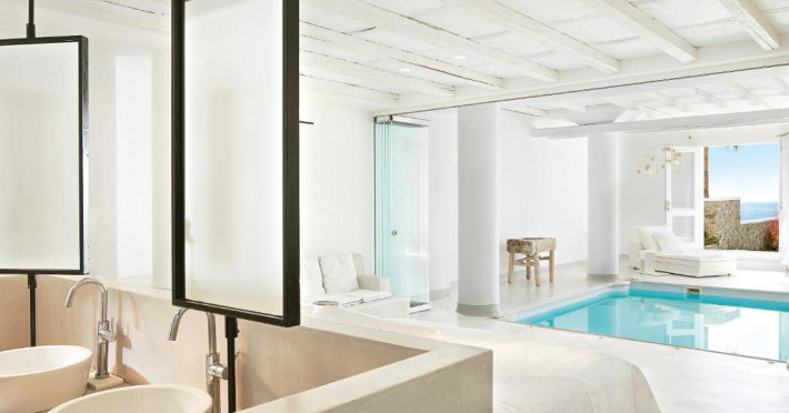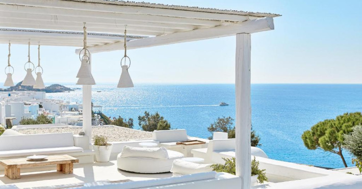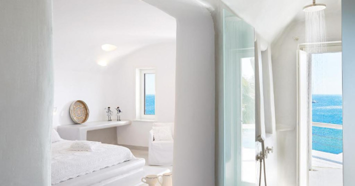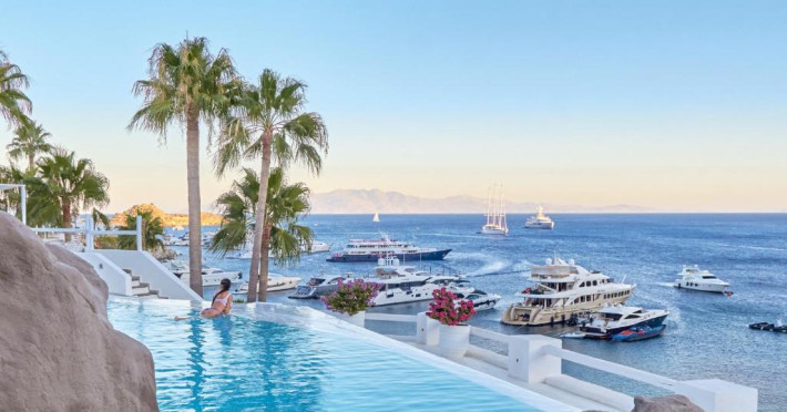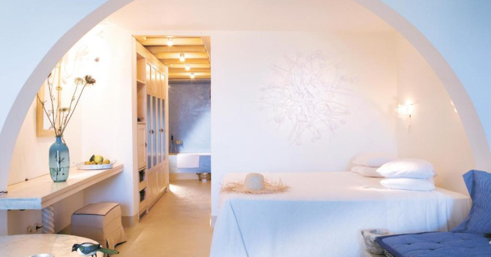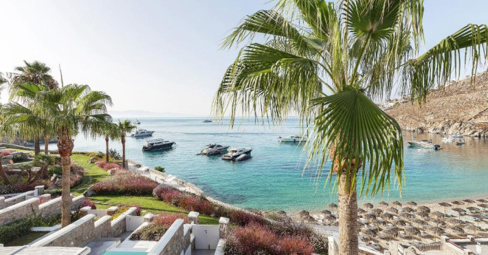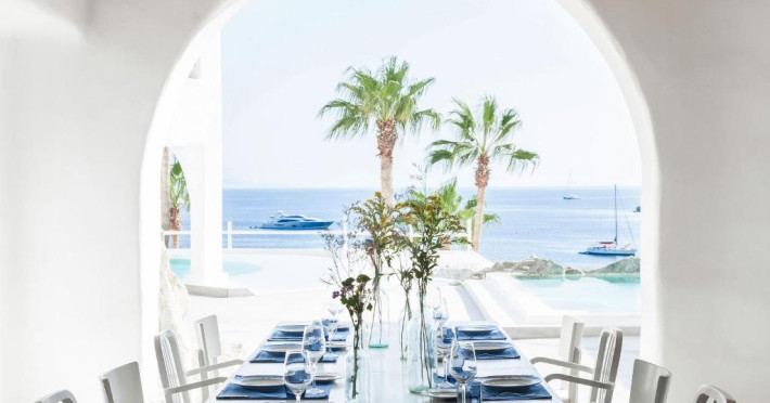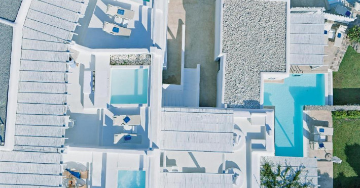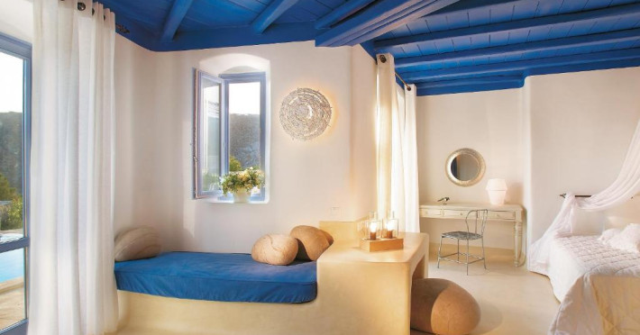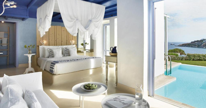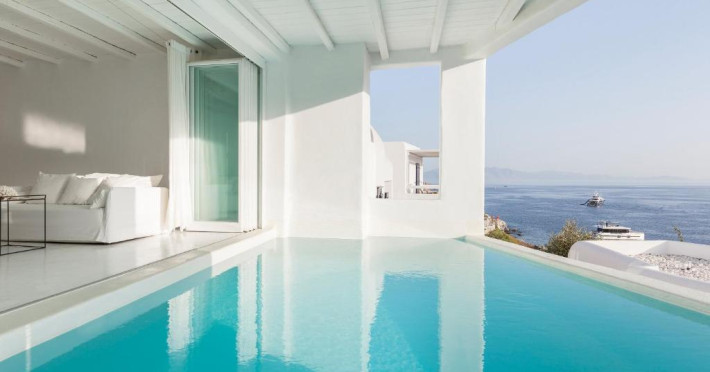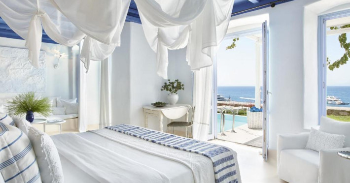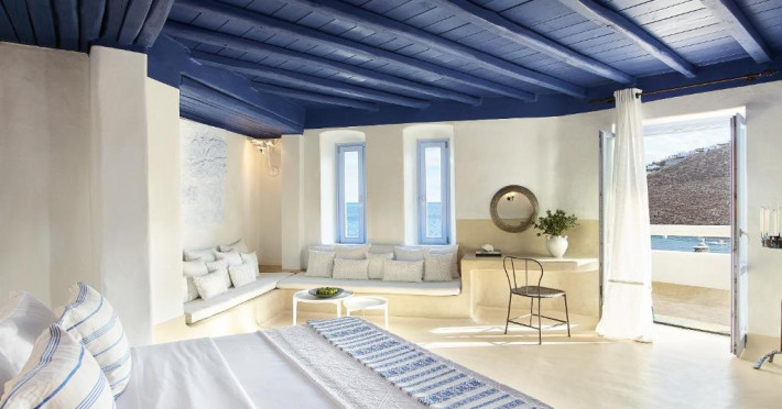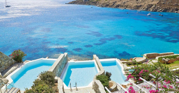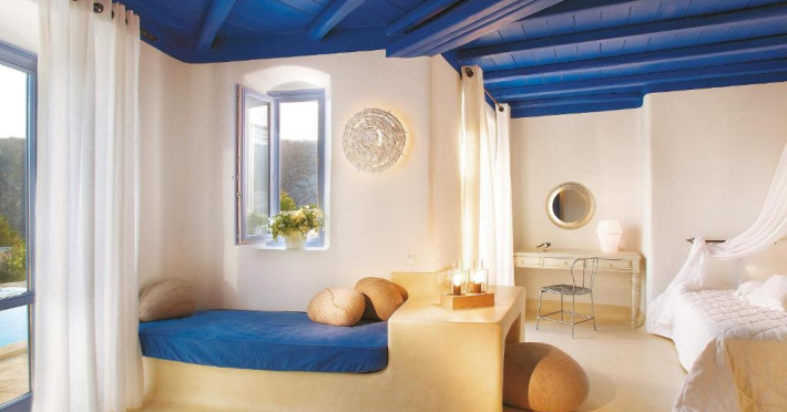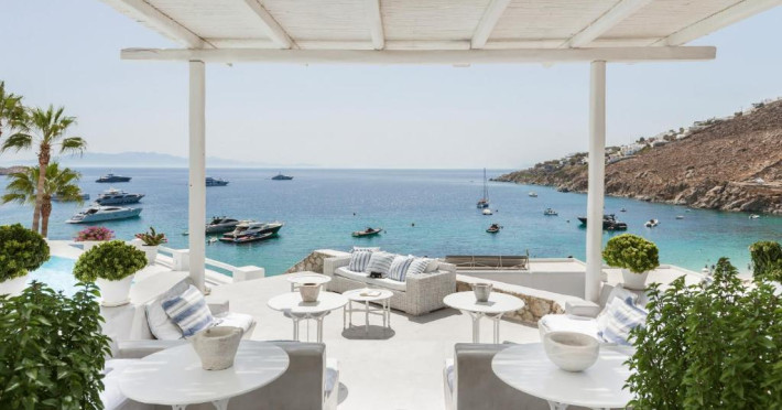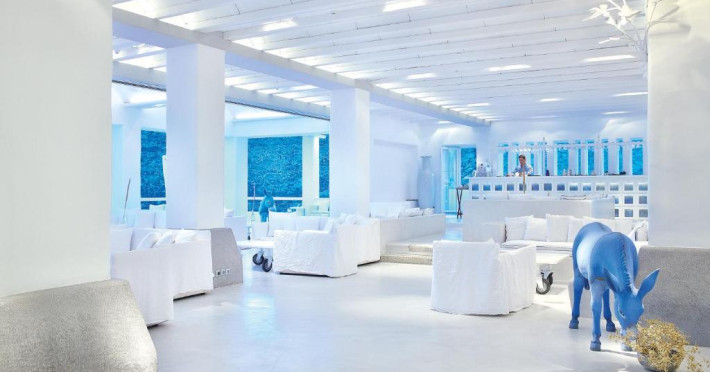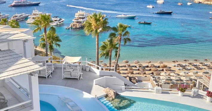 Complexul Mykonos Blu, Grecotel Exclusive are un centru spa, o piscină infinită pe 2 nivele si spatii de cazare luxoase, cu vedere la mare. Acesta este amplasat pe partea privată a plajei Psarou si oferă sezlonguri gratuite pe plajă.
