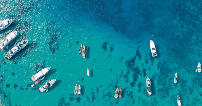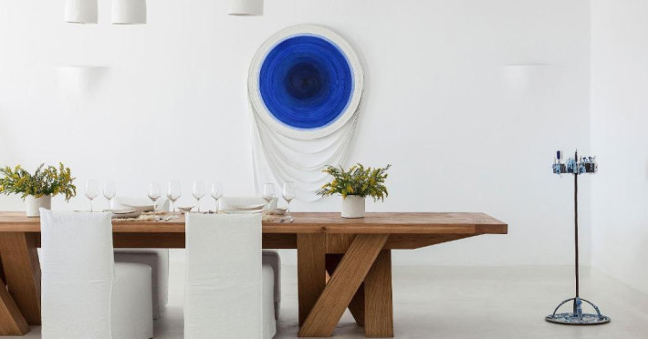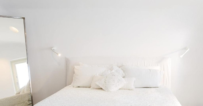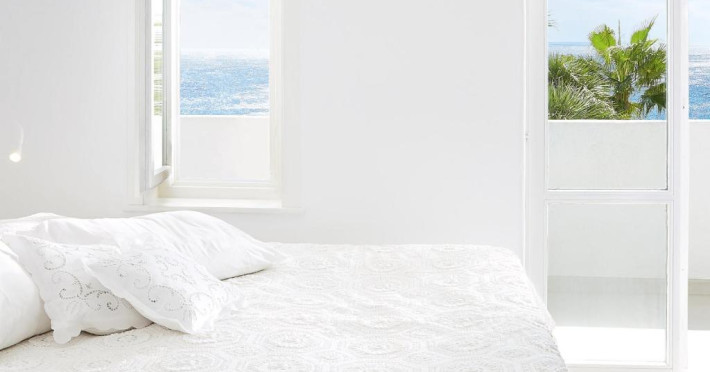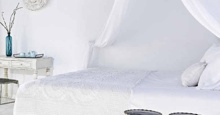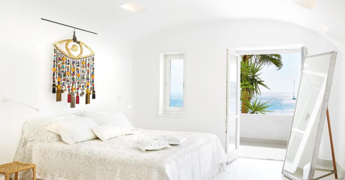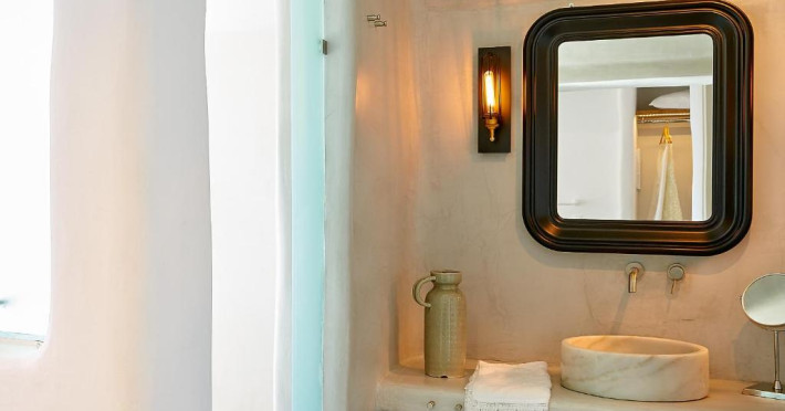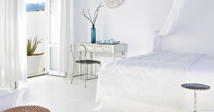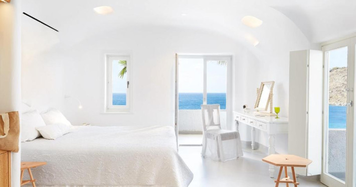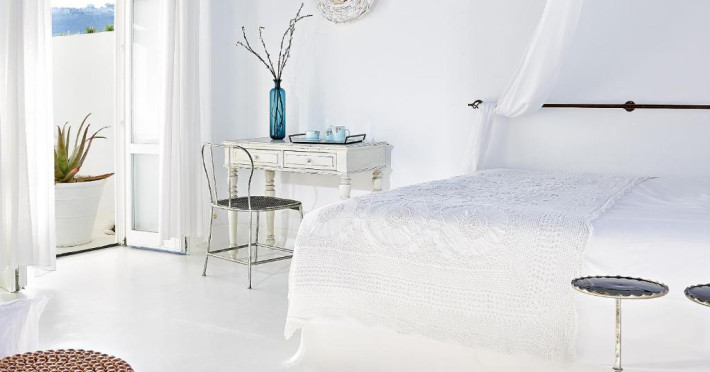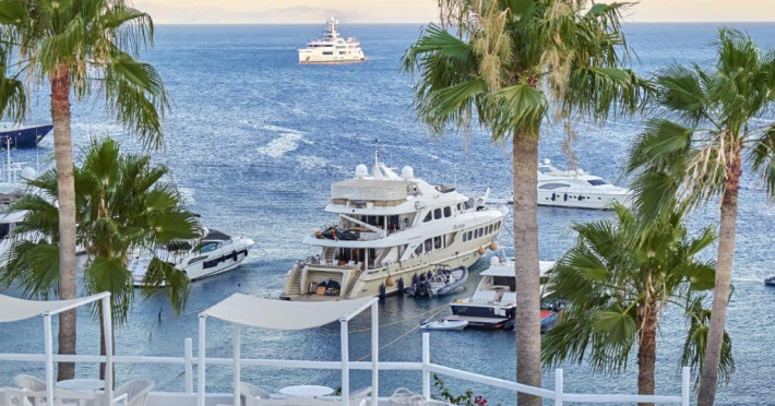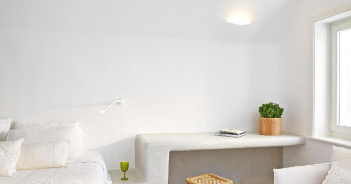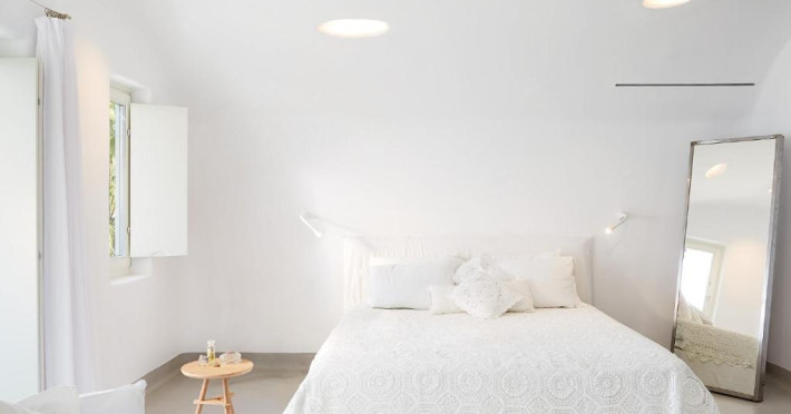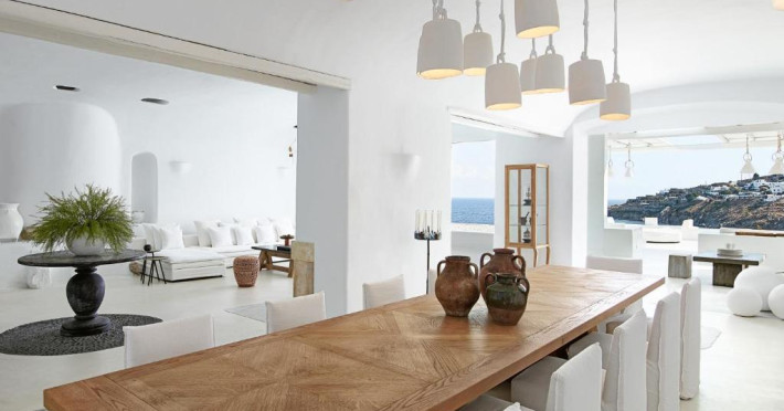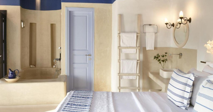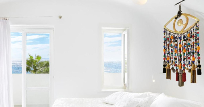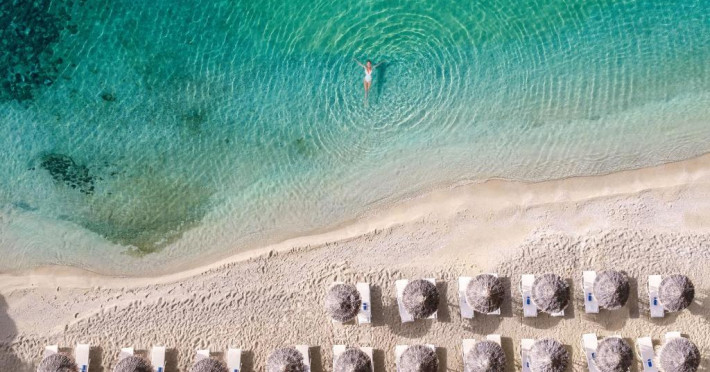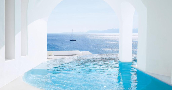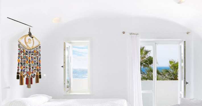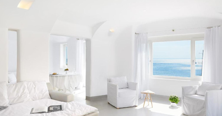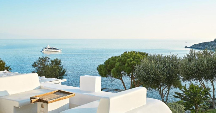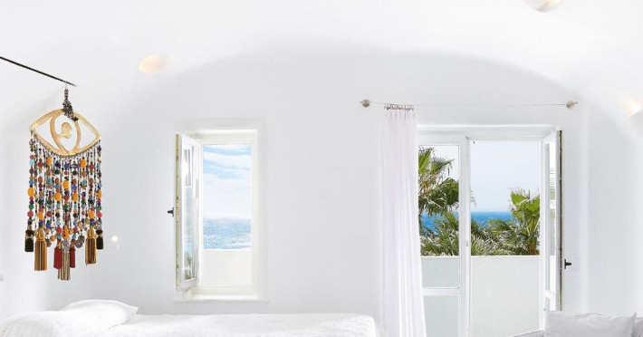 Complexul Mykonos Blu, Grecotel Exclusive are un centru spa, o piscină infinită pe 2 nivele si spatii de cazare luxoase, cu vedere la mare. Acesta este amplasat pe partea privată a plajei Psarou si oferă sezlonguri gratuite pe plajă.