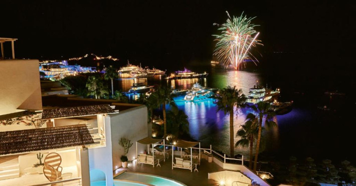 Aeroportul din Mykonos se află la 4 km de complex. Orasul Mykonos este situat la 20 de minute de mers cu masina. De asemenea, hotelul poate oferi excursii de navigatie la asfintitul soarelui, in timpul cărora se serveste sampanie, si tururi cu elicopterul.
