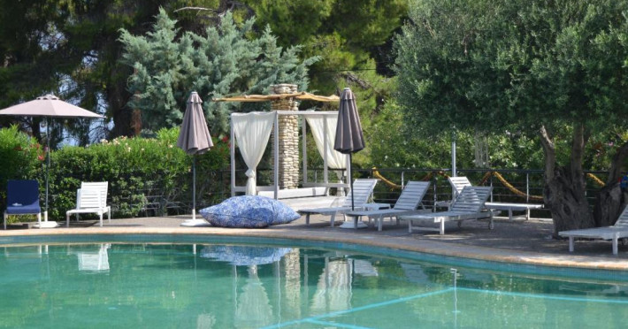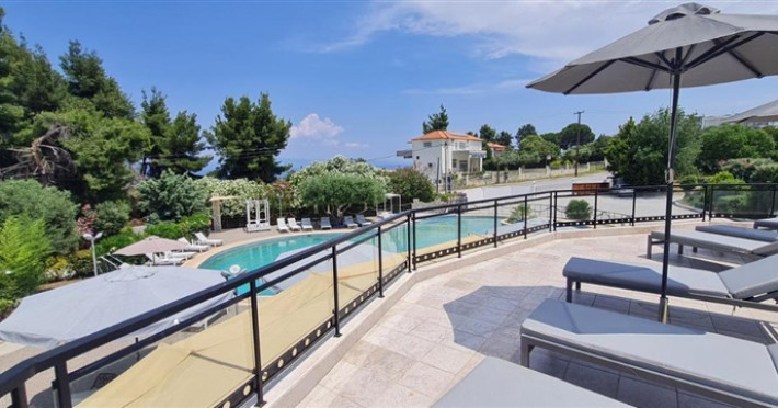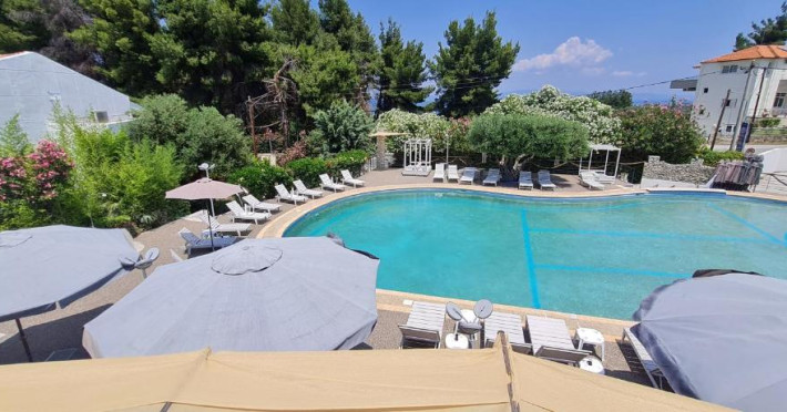 Hotel Greek Pride Aithrion se afla inconjurat de pini si palmieri, la 350 de metri de plaja cu nisip Kriopigi din Halkidiki,