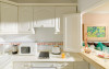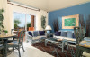 Ceiling fan, living room with TV and sofa bed, dining area, kitchenette with fridge, microwave, kettle, coffee maker, private bathroom with hairdryer and amenities.