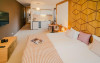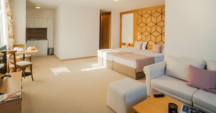 Apartamentele cu un dormitor compus din living spațios cu chicinetă utilată, zonă de luat masa, zonă de relaxare, cu o canapea extensibilă convertibilă și dormitor separat. Toate apartamente cu un dormitor au terasa cu o masă și scaune.