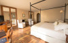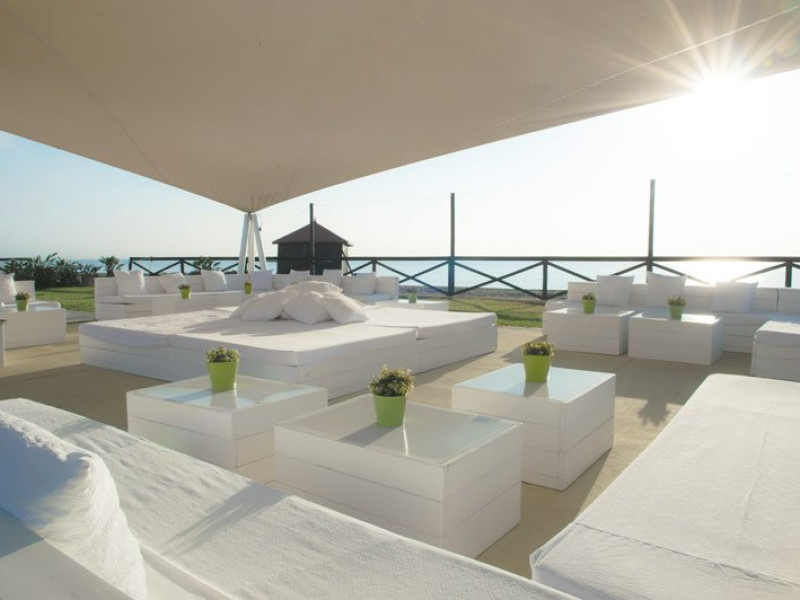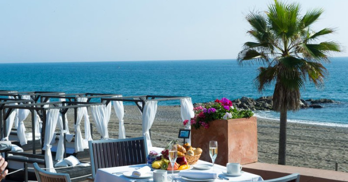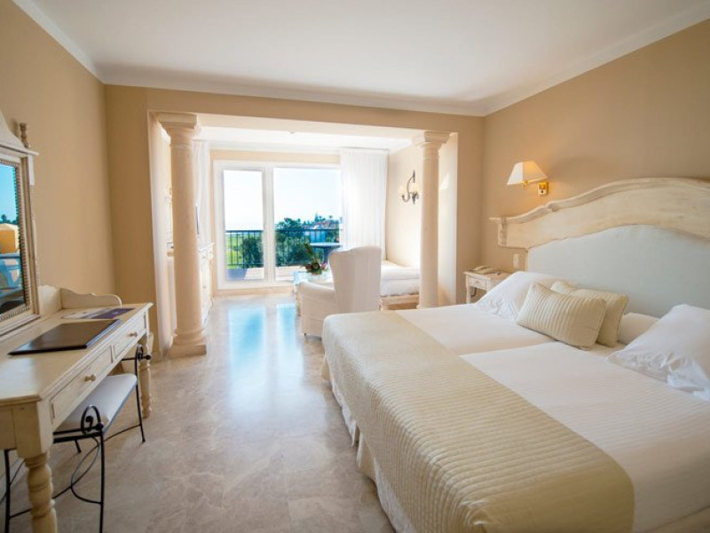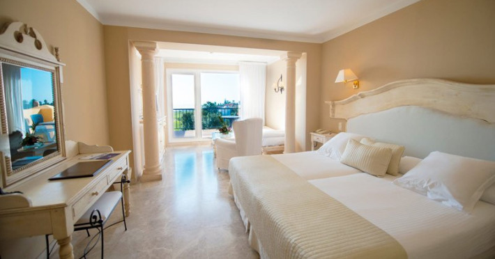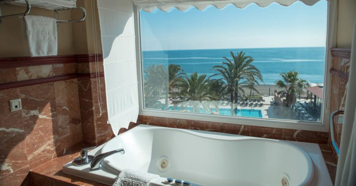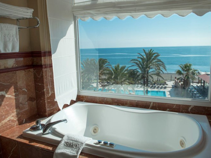- Suita Guadalmina (dormitor fara usa cu 2 paturi sau un pat matrimonial si living cu canapea, 60 mp); Suita Guadalmina are terasa cu vedere spre mare si acces direct la plaja. Baia este dotata cu o cada cu hidromasaj, oglinda pentru machiaj, halat de baie si papuci.