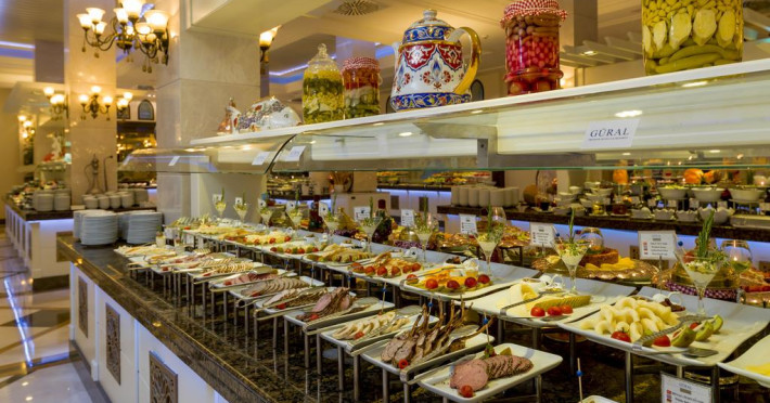 La Gural Premier Belek oaspeții au la dispoziție 2 restaurante unde pot savura mâncăruri delicioase, în stil bufet sau à la carte. Preparate din bucătăria internațională așteaptă să fie degustate în fiecare zi la micul dejun, prânz și cină. Masa poate fi servită atât în interior, cît si în aer liber, pe terasă, în funcție de vreme. Oaspeţii pot avea diverse băuturi răcoritoare sau alcoolice la bar. În cadrul proprietății există și un snack bar care servește băuturi și gustări. Pentru cei cu anumite nevoi de nutriție, Gural Premier Belek oferă meniuri pentru diete speciale.