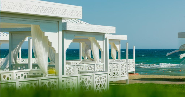 Pe plajă există șezlonguri și umbrele de plajă.