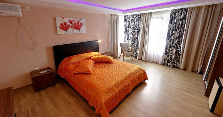Camerele duble sunt spatioase, izolate termic. Sunt dotate cu mobilier lemn masiv, pardoseala din gresie, TV-LCD cablu, minifrigider, aer conditionat, baie proprie cu cadita de dus, uscator de par, balcon si vedere spre gradina si mare.